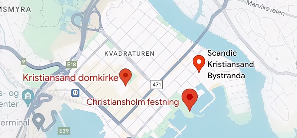 Vi skal bo på Scandic Kristiansand Bystranda og inviterer dere til å bo på dette hotellet sammen med oss. Hotellet er ca. 250 meter unna selskapslokalet (kart nederst). Hoteller ligger på bystranda, rett ved sjøen. I samme bygg er det Aquarama badeland med utendørs basseng, café, apotek, treningsstudio og spa.